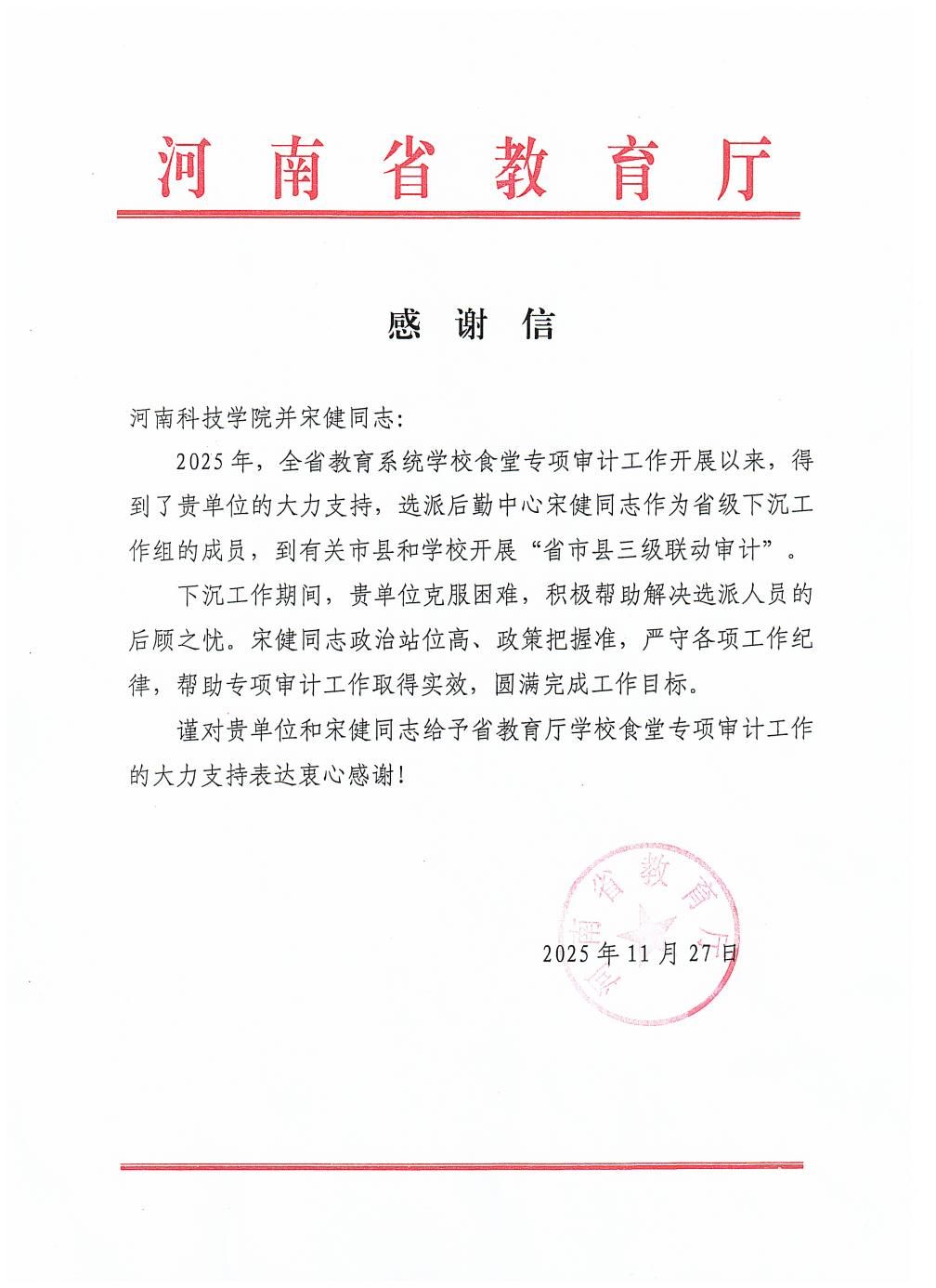 近日,河南省教育厅向我校发来一封感谢信,对学校在“2025年全省教育系统学校食堂专项审计”工作中给予的大力支持表示衷心感谢,并对后勤服务中心宋健同志在专项审计工作中的出色表现予以高度肯定和表彰。