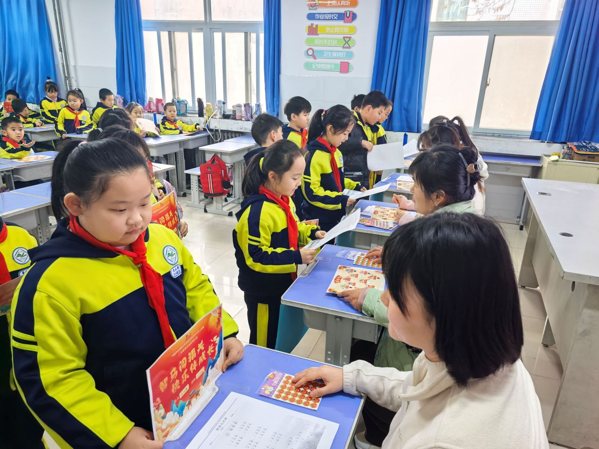 各测评区域内,孩子们手持精心设计的“集贴卡”,兴致盎然地穿梭于各个闯关点位之间。一年级“写话冲浪岛”“背诵欢乐谷”的语言表达闯关、“科学大闯关”的探索实践、“分类小达人”“生活小能手”的生活应用挑战,二年级“妙语连珠岛”“好词对对碰”的语言运用进阶、“口算小天才”“识图小达人”的数理思维比拼,各关卡环环相扣、趣味十足。孩子们或凝神思考、或大胆表达、或动手操作,在沉浸式闯关中完成知识与能力的综合展示,每通过一关,便收获一枚代表成功的“优”“奖”印章,集贴卡上的印记也随闯关进度渐渐丰富。